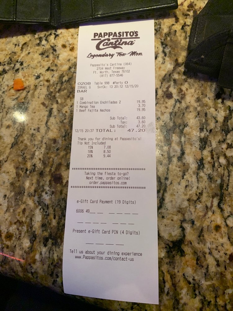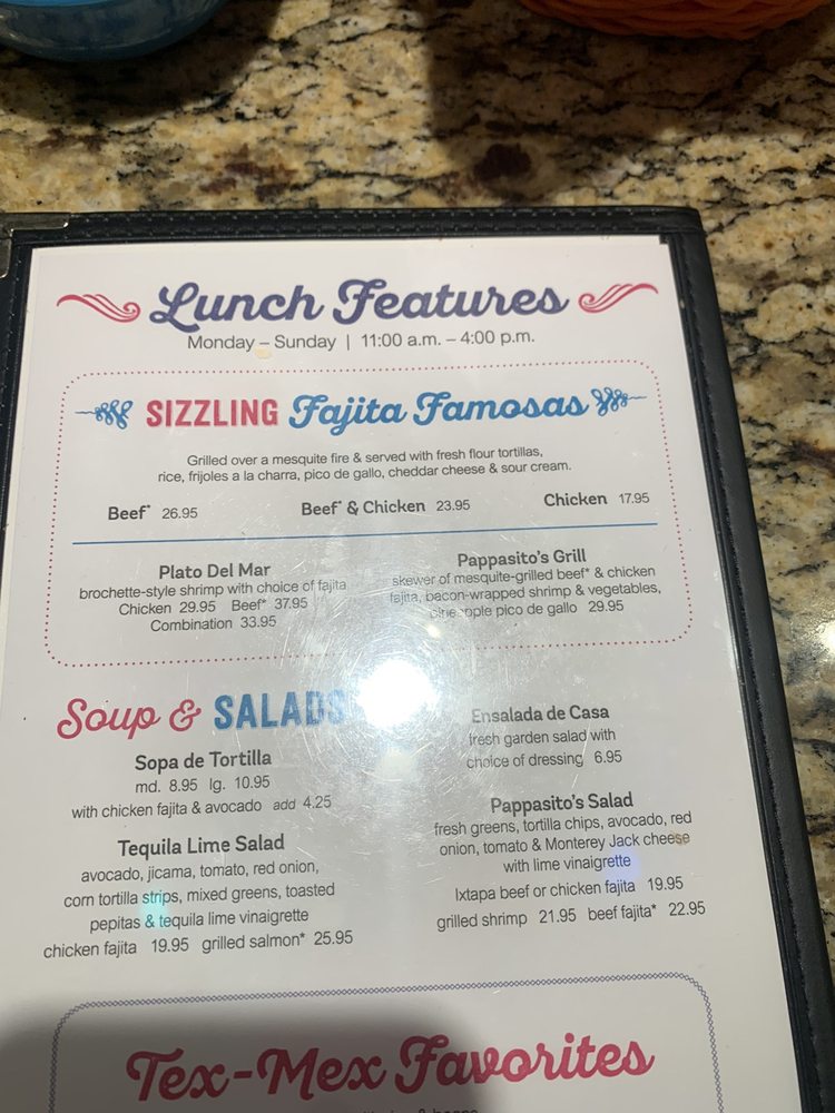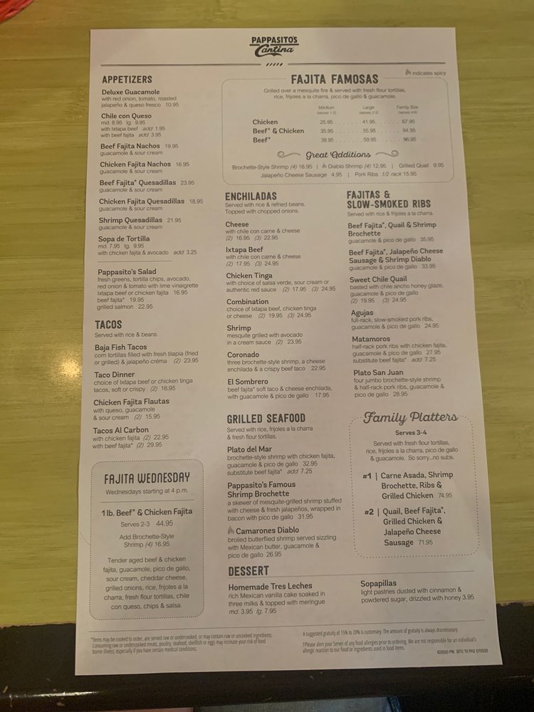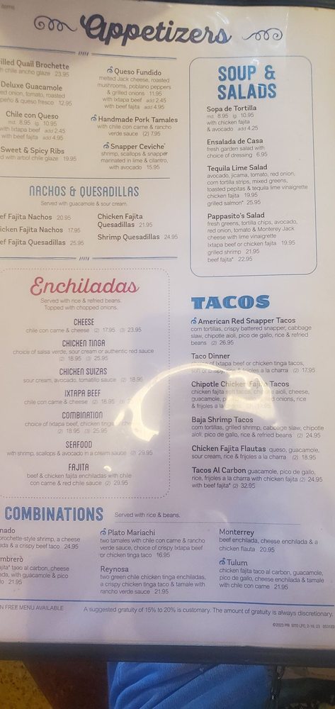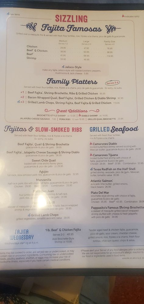 Introducing the menu at Pappasito's Cantina, a Seafood - Tex-Mex restaurant in Fort Worth, TX. This vibrant eatery offers a variety of options including Nachos, Quesadillas, Appetizers, Soups, and Salads. Standout dishes include Beef Fajita Nachos, Chicken Fajita Quesadillas, Handmade Pork Tamales, and Tijuana Caesar Salad. Customers rave about the quality of the food and drinks, especially the fajitas which are perfectly seasoned and served with fresh homemade tortillas. The service is commendable with friendly staff adding to the welcoming atmosphere. While the restaurant can get busy, the delicious meals and attentive service make the wait worthwhile. With ample seating, a full bar, and vegan options available, Pappasito's Cantina is a top choice for those seeking a flavorful dining experience.